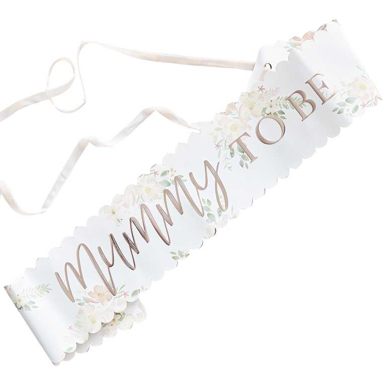 Solendida fascia bianca con scritta rose gold “Mummy to Be” e fiori, perfetta da indossare al tuo Baby Shower! La confezione contiene 1 fascia misura 11cm x 76cm.