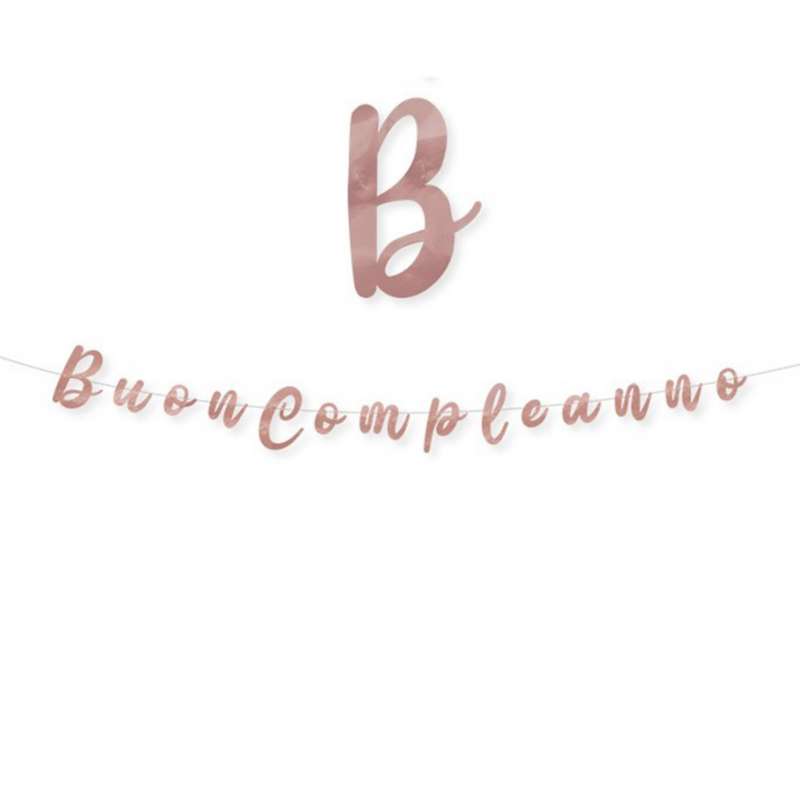Festone Buon Compleanno colore Rose Gold in cartoncino con filo di Nylon. E’ già composto ed è regolabile. La lunghezza è 3 mt e l’altezza è 15 cm. Con queste bandierine a tema renderai ancora più speciale il tuo Sweet Table!