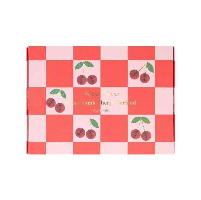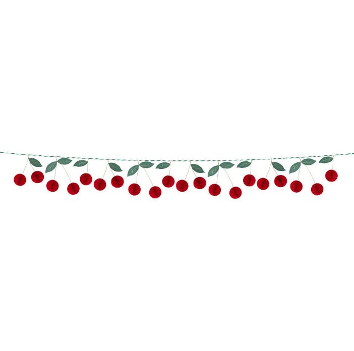 Splendido festone con ciliegie a nido d’ape e foglie verdi, perfetto come decorazione per un party estivo super originale!