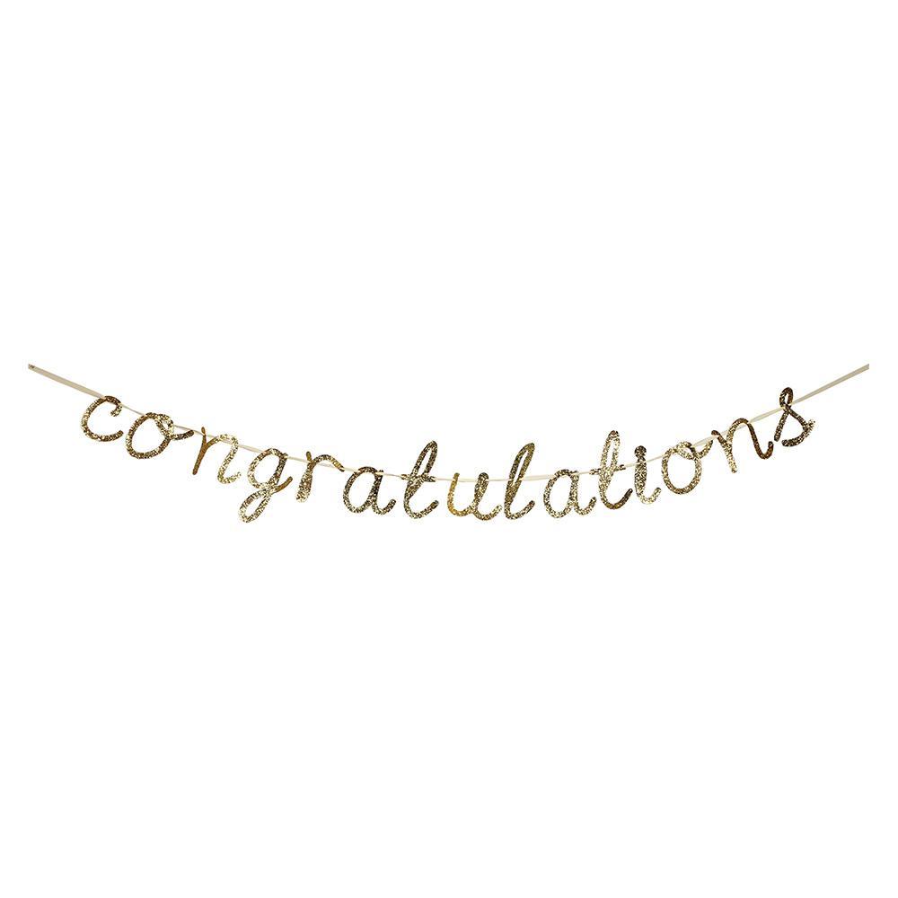 Incredibile festone oro glitter con scritta “Congratulations”, perfetto per la tua festa di Laurea! Il nastro in cotone è lungo 4,3 cm e le lettere sono alte 9,5 cm.
