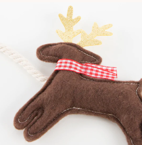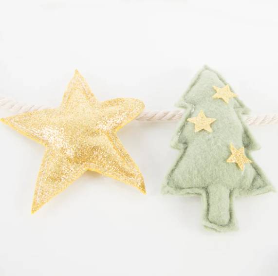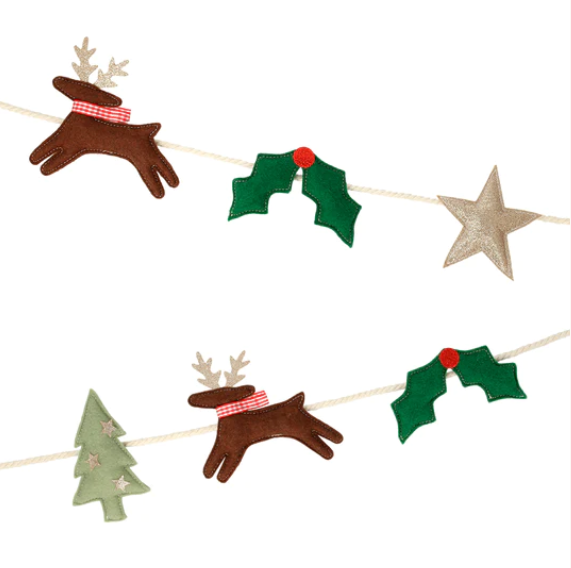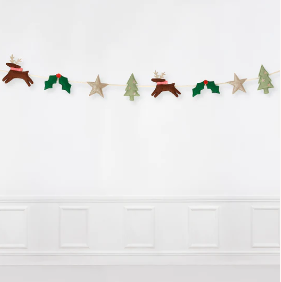 Meraviglioso festone in feltro con splendidi simboli natalizi, perfetto per il tuo Christmas Party! È dotato di renne, agrifoglio, stelle e alberi di Natale, tutti leggermente riempiti per un effetto 3D.