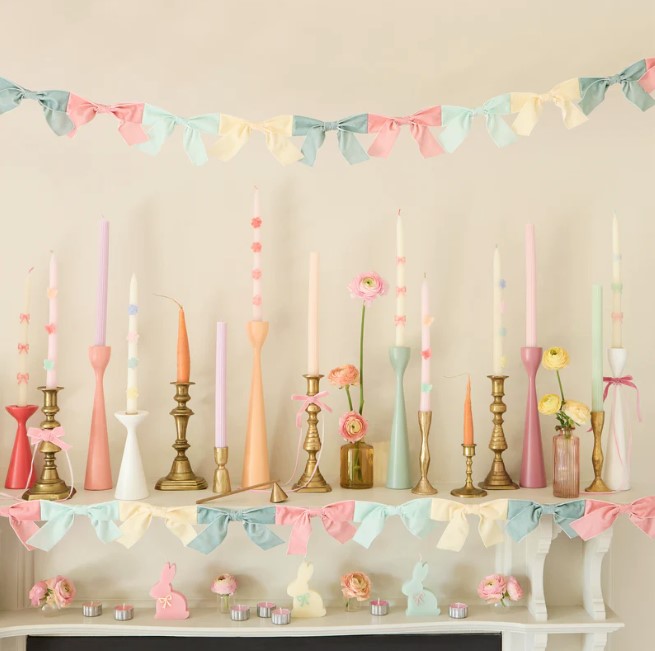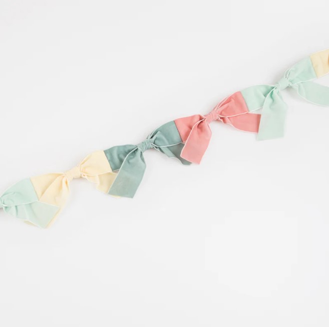 Meraviglioso festone con fiocchi in velluto in diverse tonalità pastello, perfetto per aggiungere un tocco di eleganza a qualsiasi evento speciale! Lunghezza ghirlanda – 1,7 m