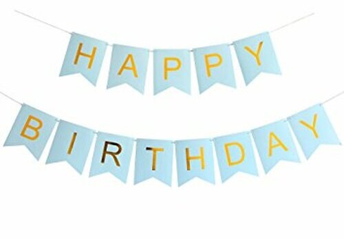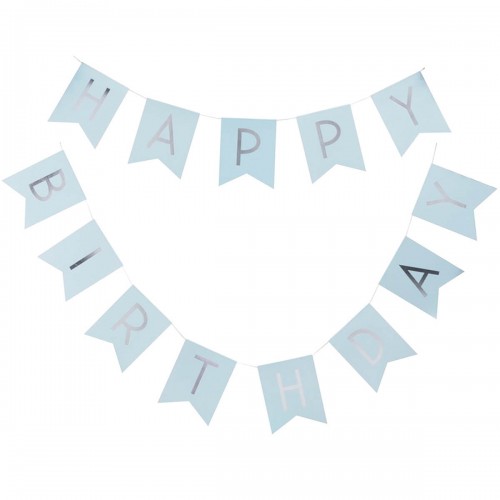 Splendido festone celeste con scritta argento Happy Birthday, perfetto da appendere alla parete o allo Sweet Table! Il festone è su due fili. Lunghezza totale 2,5 m.