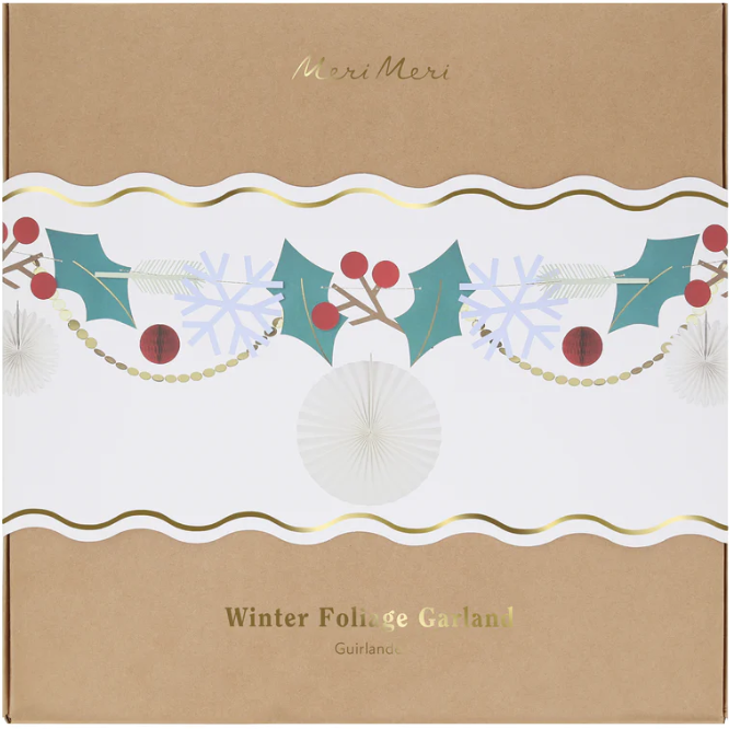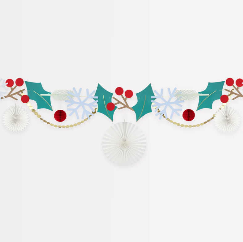 Meraviglioso festone invernale con fiocchi di neve, rosoni e agrifogli, perfetto come decorazione natalizia! Lunghezza ghirlanda – 2,4 m