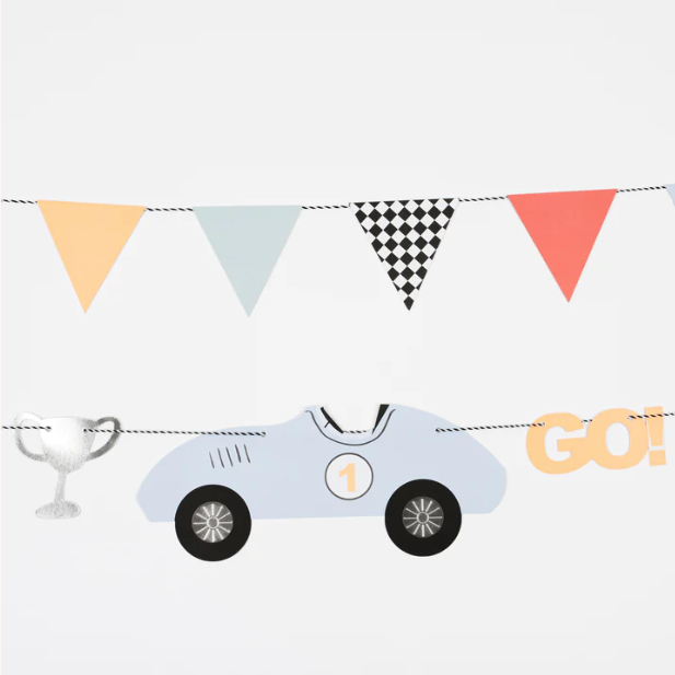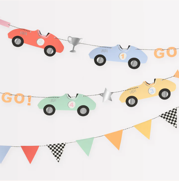 Aggiungi un look nostalgico alla tua festa a tema auto da corsa con questo festone in stile vintage! I dettagli in lamina d’argento e le bandiere dai colori vivaci aggiungono anche un tocco divertente!