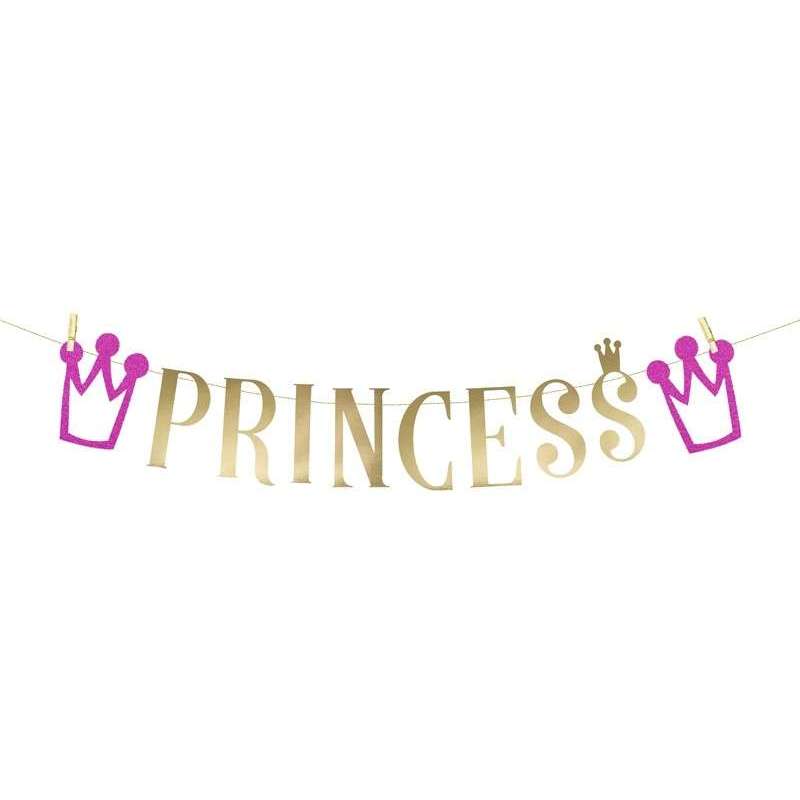 Festone decorativo Princess colore Oro Metallizzato effetto Specchio con coroncine Fuxia Glitter. E’ in cartoncino sagomato e il filo è dorato. La dimensione è 13.5cm x 90cm circa. E’ la decorazione perfetta per festeggiare la tua Principessa!