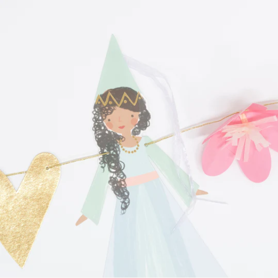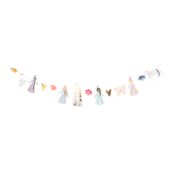 Meraviglioso festone a tema principesse con unicorni, fiori, farfalle, un castello magico, cuori d’oro e un cigno.