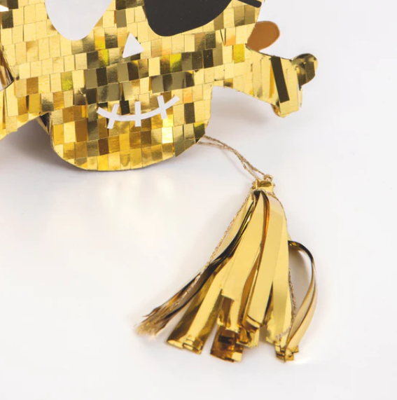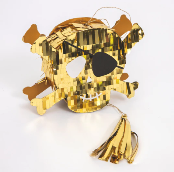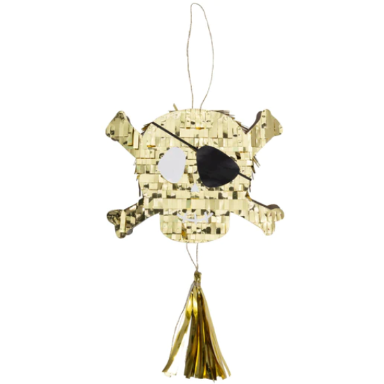 Mini Piñata a forma di Teschio dei Pirati, perfetta come segnaposto o regalino di fine festa! E’ decorata con frange di carta velina oro ed è piena di coriandoli colorati e tatuaggi temporanei! C’è anche spazio per riempirla con altri dolcetti a tua scelta.