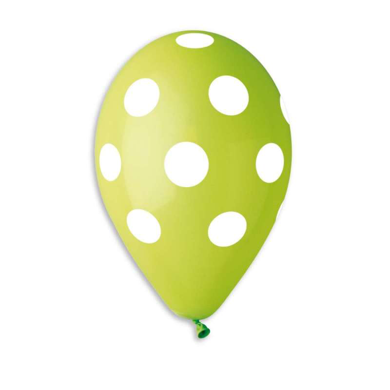 Palloncino Professionale in Lattice Verde Lime Stampato con Pois Bianchi. Diametro 30 cm / 12 “. Adatto per gonfiaggio ad elio o ad aria.