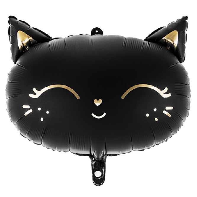 Dolcissimo Palloncino in Mylar a forma di gattino nero con dettagli oro, perfetto per il tuo Halloween Party! E’ dotato di valvola autochiudente e misura 48cm x 36cm (19″ x 14″).
