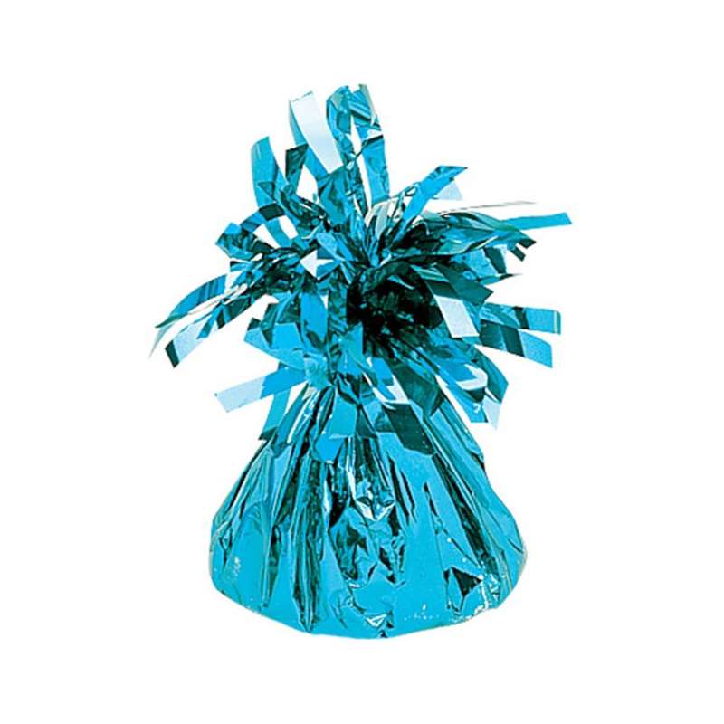 Pesetto con Ciuffo in Foil, colore Celeste. Dimensione 6 cm x 13 cm. Utilizza questo pesetto per legare i palloncini gonfiati ad elio!