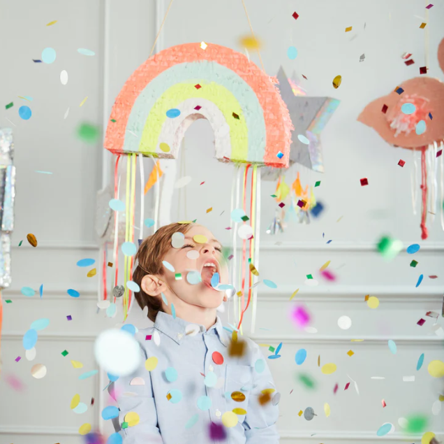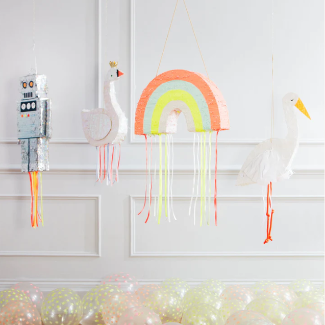 Fantastica Piñata a forma di Arcobaleno, splendidamente realizzata con frange di carta velina e decorata con nastri colorati.
