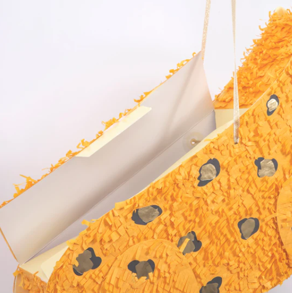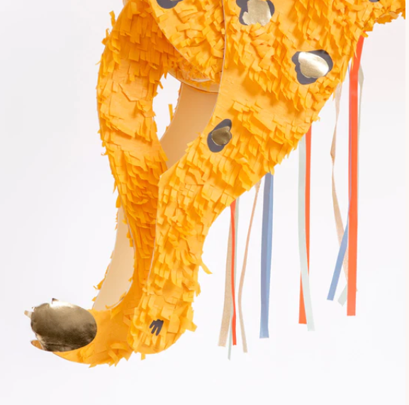 Incredibile Piñata a forma di Ghepardo, perfetta per la tua festa a tema Safari! Splendidamente realizzata con frange di carta velina, dettagli in lamina d’oro e nastri colorati.