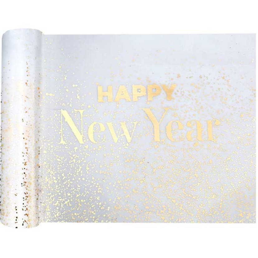 Meraviglioso runner bianco con dettagli e scritta oro “Happy New Year”, perfetto per festeggiare capodanno! Dimensione: 5mt x H.28cm