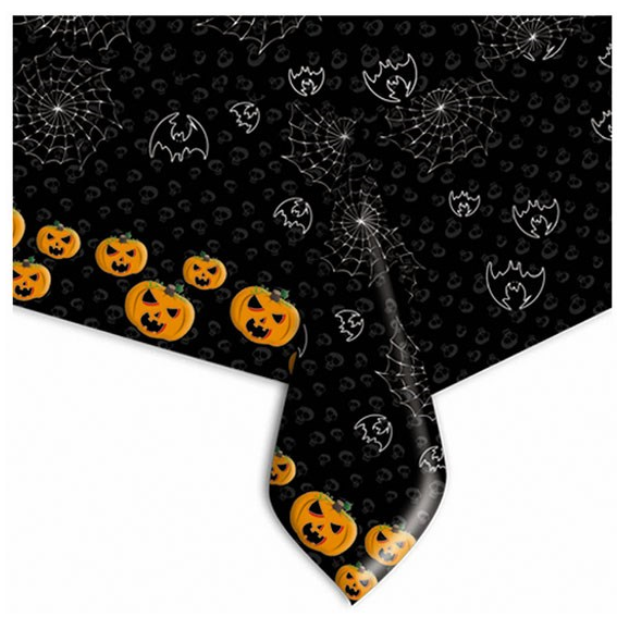 Incredibile tovaglia in plastica nera con zucche arancioni, perfetta per il tuo Halloween Party! Dimensione: 140 x 270 cm.