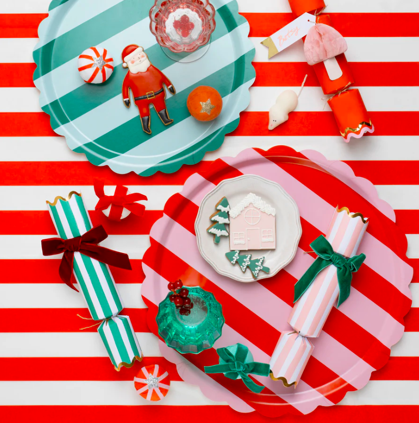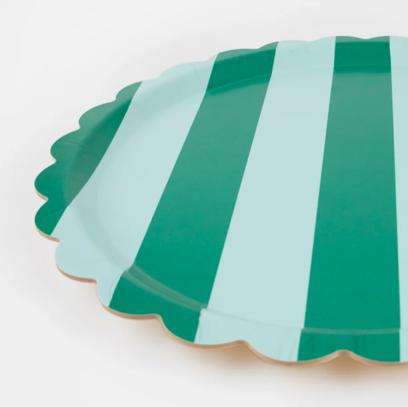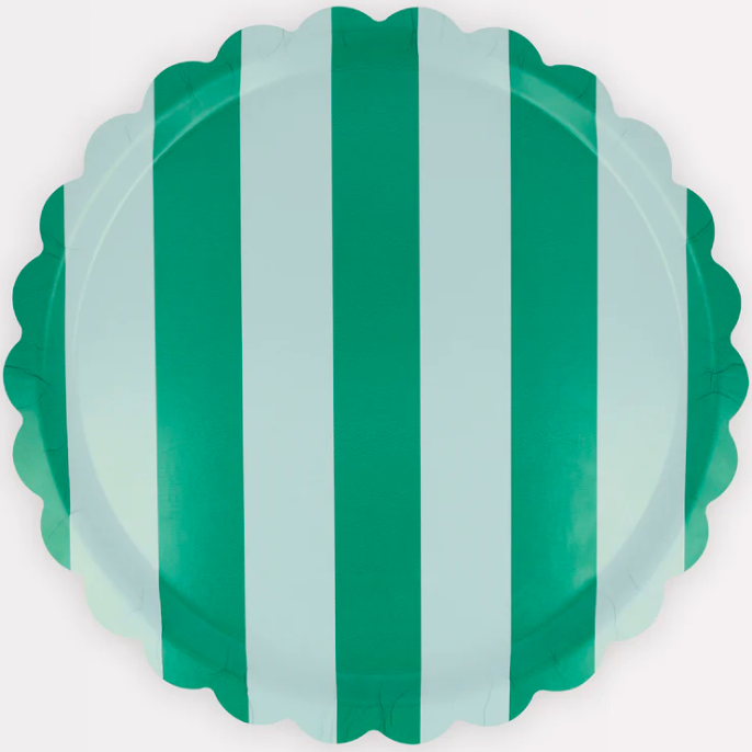 Meraviglioso vassoio in melamina a righe verdi e menta con bordo smerlato, perfetto per qualsiasi occasione speciale e per la tavola di Natale! Dimensione 30.8 x 30,8 cm.